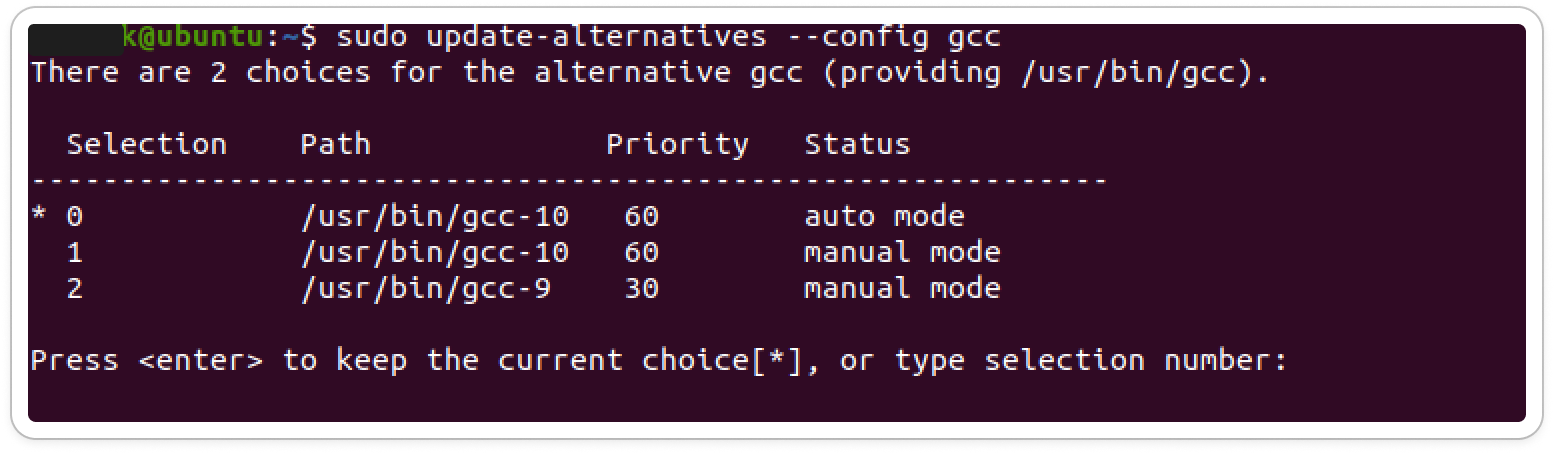 $ sudo update-alternatives --config gcc