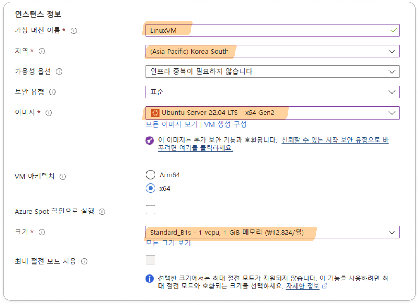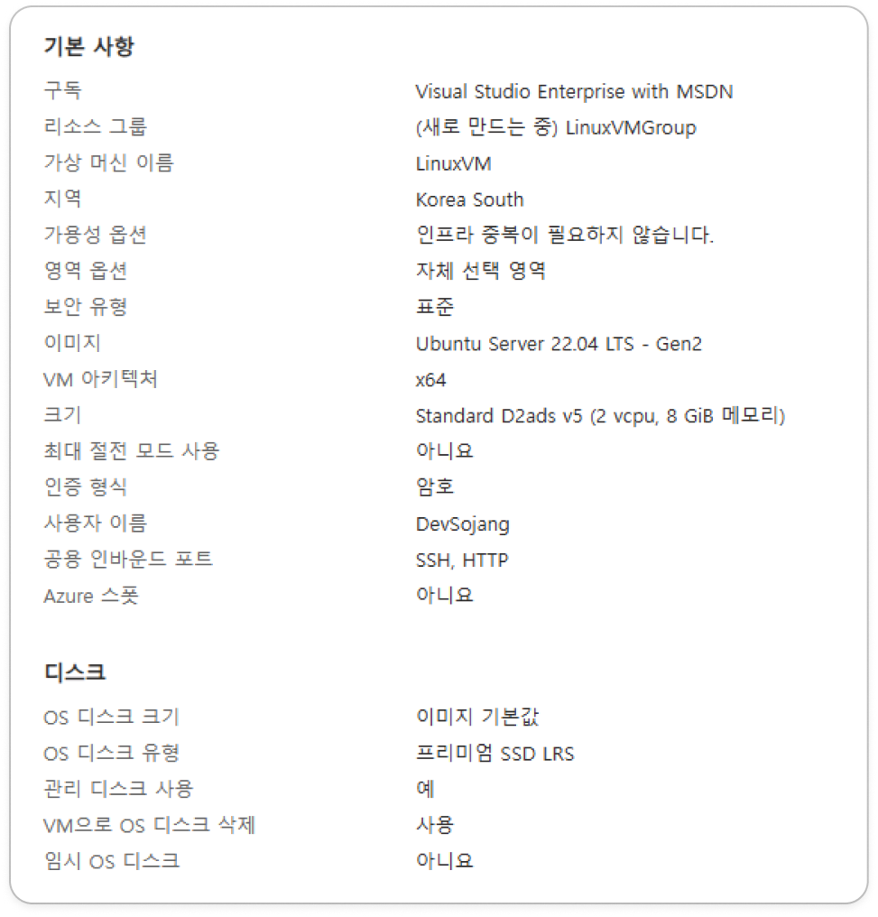 가상 머신 만들기 페이지가 열리고 만들려는 가상 머신의 세부 정보를 확인할 수 있습니다.