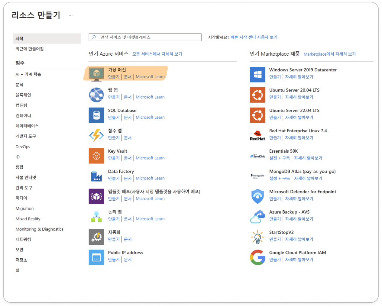 Azure 서비스의 리소스 만들기를 선택 하고 리소스 만들기 창이 열리면 가상 머신을 선택합니다.
