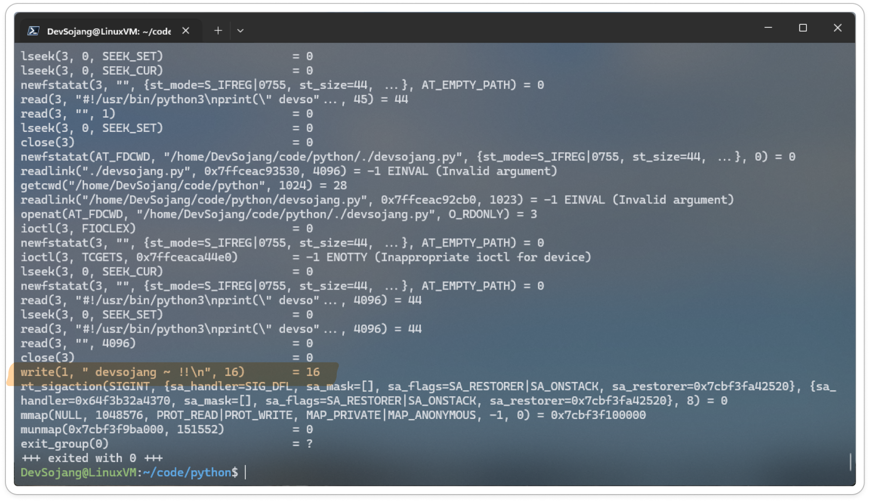 devsojang.py.log 파일에도 동일하게 write() 함수로 System Call이 사용된 것을 확인할 수가 있습니다.