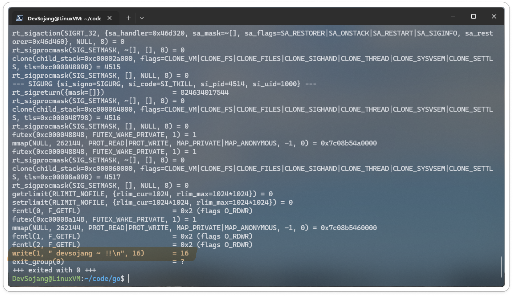 devsojang.log 파일을 열어보면 write() 함수로 System Call이 사용된 것을 확인할 수 있습니다.